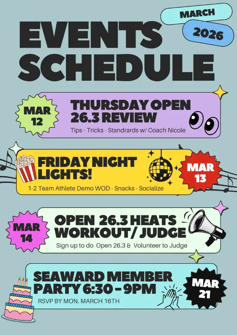 Seaward CrossFit will be participating in the Open workouts for the 12th year. We will be running a very similar program to previous years. Here are some of the important things to note: